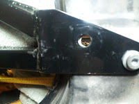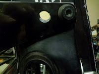 On to the lower X-brace. I had to cut off a little mounting stud from the right side rail just in front of the rear mount bracket (formerly used with the fuel-line plastic retainer). Both sides have a nice little plastic plug that pops out so you can slip the 14mm bolt down through it and have room for some adjustment. Go ahead and get the nut started on that bolt with the x-brace arm. I tightened it up a little just to get it flush with the bottom surface, but loose enough to be able to still position it just right. You're going to have to drill 3 times per side, so it's handy to have the bolt hold it in place once you've got it lined up and in the center bracket. I did not end up drilling yet as it was getting too late, and I was short on hardware to put in the holes anyway. Somewhere along the way I'm out 16 washers, and one of the lock nuts I have is the wrong thread pitch, so a trip to Lowe's tomorrow should remedy that. I need to pick up a better drill bit set too, so no biggie...just frustrated my effort today to get more accomplished.