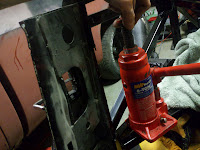 I spent a good while today rummaging through all of the facebook albums on the Smyth Performance page, reading the various comments and seeing if I could make enough sense of the scope to press forward. It's a bit difficult for me to know what's next exactly, because some of the parts I have are installed over/on/after some of the parts I do not yet have. No matter, I still have plenty I can work on. I went through my trailer full of spare Jetta parts I've been collecting and cleaned up the extra K-member I'll be using in the rear. I was going to separate the spindles for the rear wheels, but ran into trouble on the tie-rod bolt. After fussing with it for a while I decided to move on.